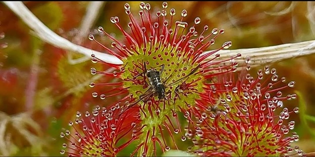 Peste tot întâlnim planta carnivoră roua cerului (Drosera rotundifolia) care își întinde antenele lipicioase cu care prinde insectele, încercând să își completeze deficitul de substanțe nutritive oferit cu zgârcenie de mlaștina imensă.