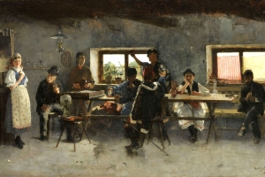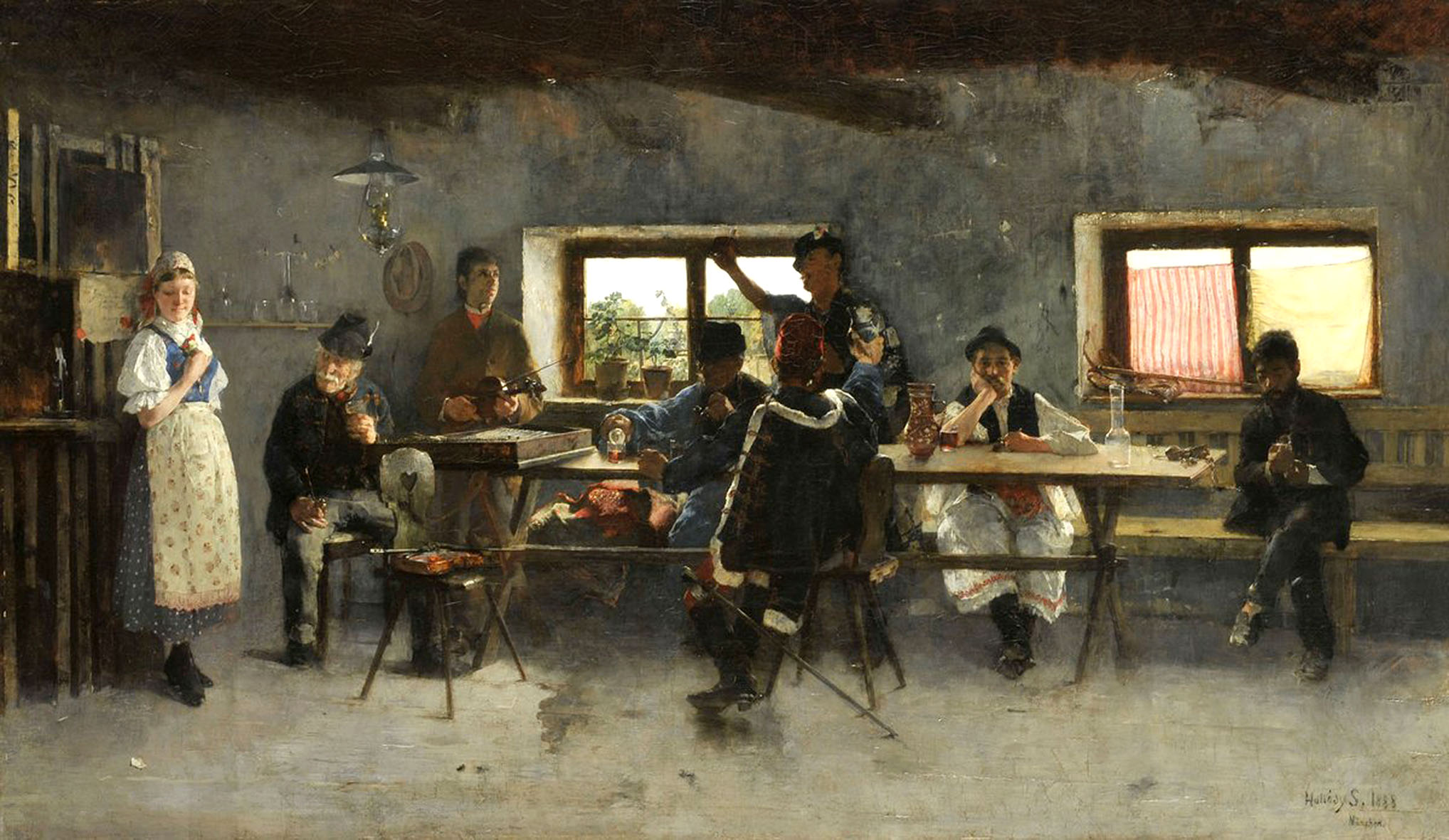 7 Hollósy 1888: Simon Hollósy, Cheflii la cârciumă, 1888, München, ulei pe pînză, 80 × 138 cm, © Szépművészeti Múzeum – Magyar Nemzeti Galéria: https://en.mng.hu/artworks/revellers-in-the-tavern/
