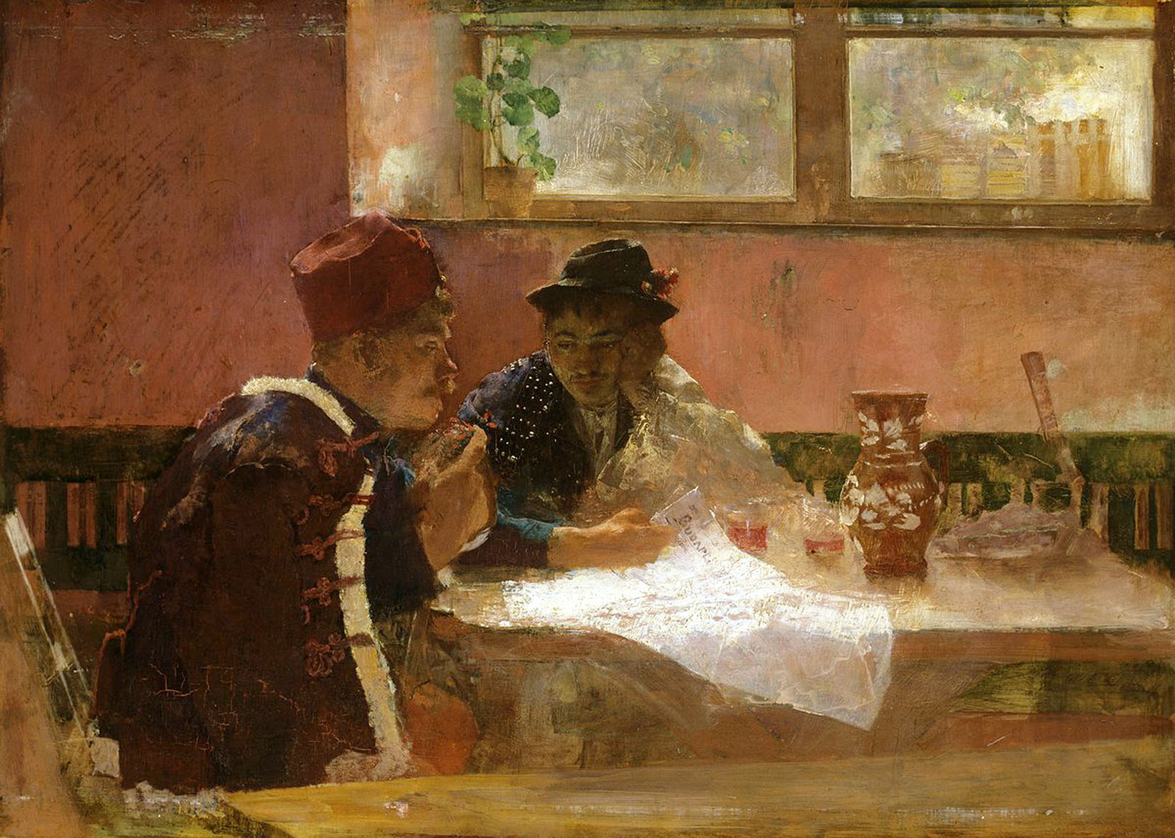 8 Hollósy 1893: Simon Hollósy, Necazurile țării, 1893, München, ulei pe panel de lemn, 37,3 × 52,8 cm, © Szépművészeti Múzeum – Magyar Nemzeti Galéria: https://en.mng.hu/artworks/the-countrys-troubles/