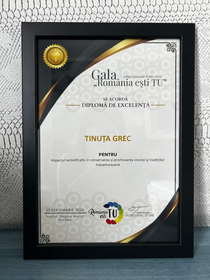 Vineri seară, la Teatrul „Regina Maria” din Oradea a avut loc gala specială intitulată sugestiv, „România ești tu!”, care celebrează spiritul autentic românesc. La acest grandios eveniment a participat și Tinuța Grec, o scriitoare împătimită de tradițiile și autenticitatea Maramureșului. Toată munca sa pe tărâmul istoriei și etnografiei orașului Borșa, concretizată în cele 7 cărți publicate a fost apreciată și recunoscută, în cadrul acestei gale, acordându-i-se o Diplomă de excelență. Aceasta vine să încununeze și să răsplătească munca asiduă și perseverentă pentru conservarea și promovarea istoriei și tradițiilor maramureșene.