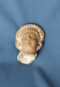 Capul de statuetă (nr. inv. 20058, L= 9 cm) este confecţionat din lut fin, pe partea exterioară şi în câteva locuri de pe partea interioară păstrându-se urme de vopsea albă. Coafura este reprezentată prin benzi care coboară vertical pe frunte şi oblic pe ceafă, terminându-se la spate într-un coc, cele două zone fiind separate printr-o despicătură. Coroana, puternic ridicată, prezintă la intervale egale mici alveole; partea centrală a urechilor este perforată. Pe partea păstrată, spre baza gâtului în zona posterioară, se poate distinge începutul unei rochii, ceea ce arată că nu este vorba despre un bust. Este capul unei statuete feminine grecești (de Tanagra) menționat în inventarul 1898-1903, nr. 19, provenind din colecția lui S. Teleki și care se presupune că a fost adus de la Pompei.