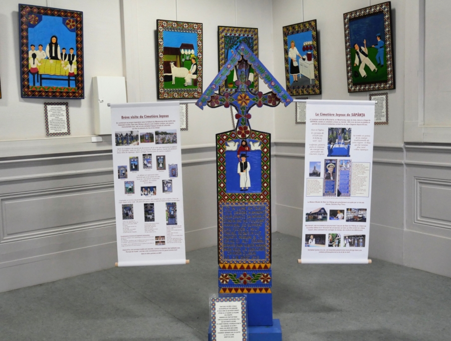Expoziția este alcătuită dintr-o cruce, 28 de panouri de stejar sculptate și pictate, 12 picturi și 40 de epitafuri (traduse în limba franceză), lucrările fiind realizate, după modelul monumentelor de artă populară din Cimitirul Vesel – singurul loc din lume unde moartea este luată în râs – de Dumitru Pop Tincu, cel care a dus mai departe moștenirea lui Stan Ioan Pătraş. Pentru activitatea sa, în anul 2021 Dumitru Pop a obținut titlul de Tezaur Uman Viu. Chiar dacă a plecat, prea devreme, la cele veșnice, arta sa și albastrul de Săpânța rămân memorie locului și timpului. ”Cimitirul este azi memoria locului și a timpului. Veritabil imn al vieții, acest ansamblu plin de culoare ne introduce într-o filosofie a existenței care susține acest popor plin de înțelepciune și credință”, scriu reprezentanții asociației Grenoble Isère Roumanie.