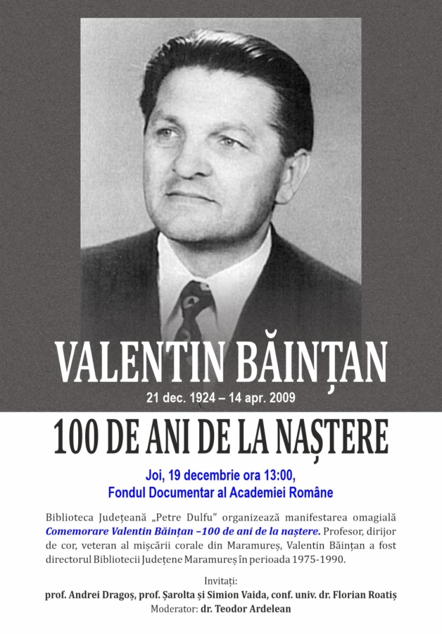 Joi, 19 decembrie, ora 13.00, la Fondul Documentar al Academiei Române, al Bibliotecii Județene „Petre Dulfu” se va organiza manifestarea omagială „Comemorare Valentin Băințan – 100 de ani de la naștere”. Profesor, dirijor de cor, veteran al mișcării corale din Maramureș, Valentin Băințan a fost directorul Bibliotecii Județene Maramureș în perioada 1975-1990.