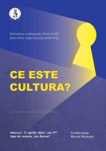 Miercuri, 17 aprilie 2024, între orele 17.30-19.00, în Sala de cenaclu „Ion Burnar” a Bibliotecii Județene „Petre Dulfu” va avea loc Conferința „Provocările gândirii- incursiune în cunoașterea omului”. Va fi o conferință-dezbatere, aflată la cea de-a șaptea întâlnire. De această dată, cei care vor fi prezenți în sală vor afla răspunsul la întrebarea: Ce este cultura?