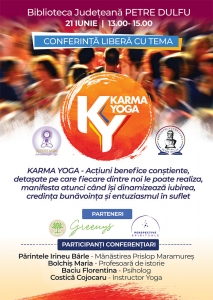 Vineri, 21 iunie 2024, orele 13.00-15.00, în Sala de conferințe a Bibliotecii Județene „Petre Dulfu” Baia Mare va avea loc conferința cu tema „Karma Yoga”, organizată de Asociația „Eruditus animo”. Tema abordată va fi despre acțiuni benefice conștiente, detașate, pe care ființa umană le poate reda, atunci când își lasă frâu liber iubirii, bunăvoinței, credinței și bucuriei sufletești.