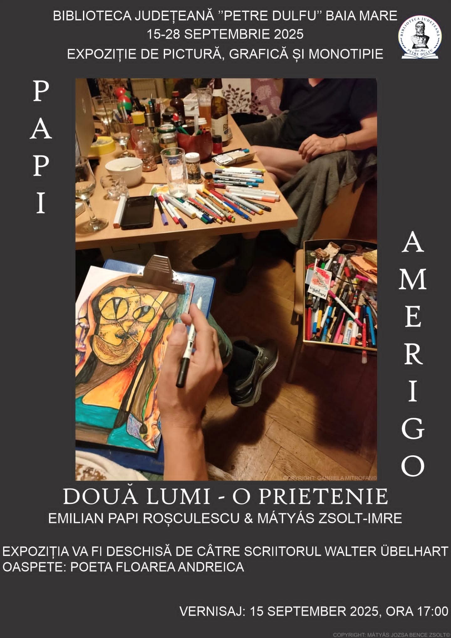 În perioada 15–28 septembrie, Biblioteca Județeană „Petre Dulfu” din Baia Mare găzduiește o expoziție de pictură, grafică și monotipie, intitulată „Două lumi – o prietenie”, semnată de artiștii Emilian Papi Roșculescu și Mátyás Zsolt-Imre.