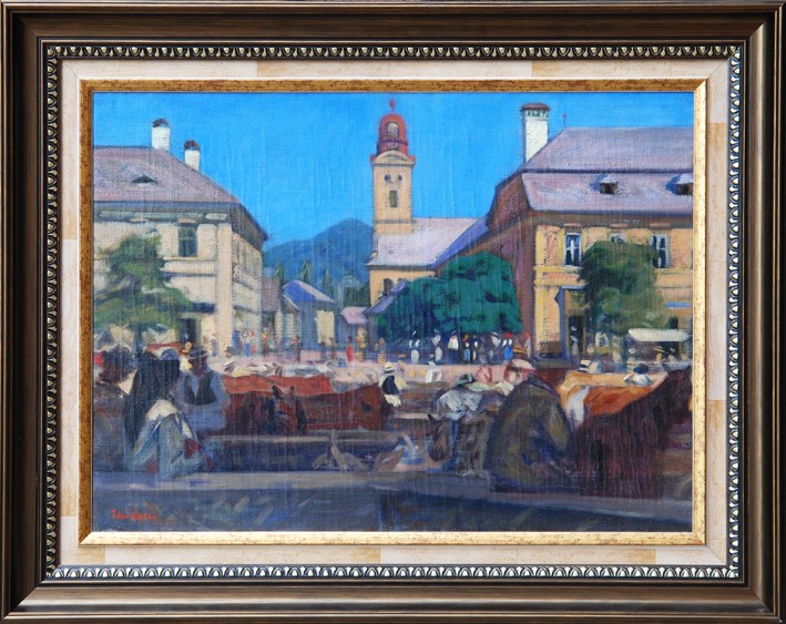 Perspectiva este realizată în mod ingenios prin alternanţa planurilor umbrite cu cele luminate, scena descriind un târg de animale la început de secol 20, având astfel şi valoare documentară. Echilibrată, simetrică, compoziţia degajă linişte. Precizia desenului, cu aplicarea riguroasă a legilor perspectivei, este completată de libertatea execuţiei picturale, personajele din planul median, mai mult caligrafiate decât redate cu exactitate, creând senzaţia de mişcare. La fel, faţă de rigoarea volumetriei clădirilor, aerul mişcă vegetaţia, pictată cu o anume libertate.