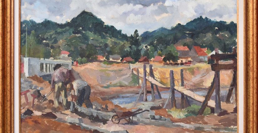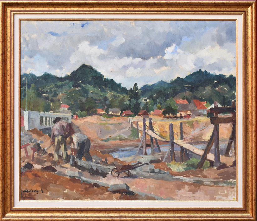 Lucrarea Construcția podului, datând de la începutul anilor 50, încadrată în tema înnoirilor socialiste, are ca subiect un șantier menit a schimba și moderniza infrastructura orașului. O punte veche stă alături de un pod ridicat în partea stângă a lucrării.