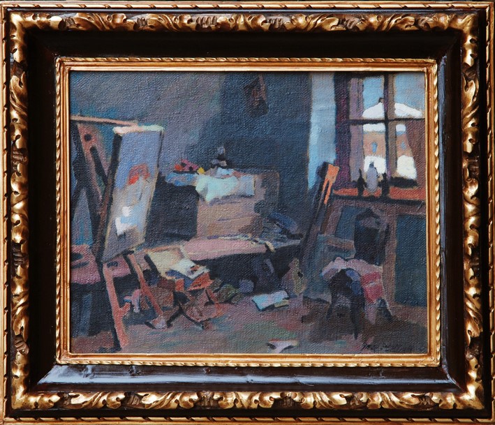 Griurile colorate din interiorul încăperii, subliniate de liniile brunurilor închise sunt animate de accentele de oranj şi vermilion. Domină subtilele raporturi valorice şi cromatice care stăpânesc interiorul atelierului. O sobrietate care induce misterul ce domină interiorul, la fel cum arta întreagă nu s-ar justifica fără mister. Doar peisajul exterior luminează, ca un adevăr brut dar relevator. Un echilibru controlat între suprafeţe potenţează compoziţia. În spaţiul artificial pătrunde dintr-o nevoie firească peisajul băimărean cu case care se întrezăreşte pe geam. Pictorul este prezent, in aparenţă, doar prin obiectele sale şi prin spaţiul în care ne face martori ai propriilor sale trăiri. Puterea de sugestie a culorii face din spaţiul închis un vehicul al stării emoţionale a pictorului.