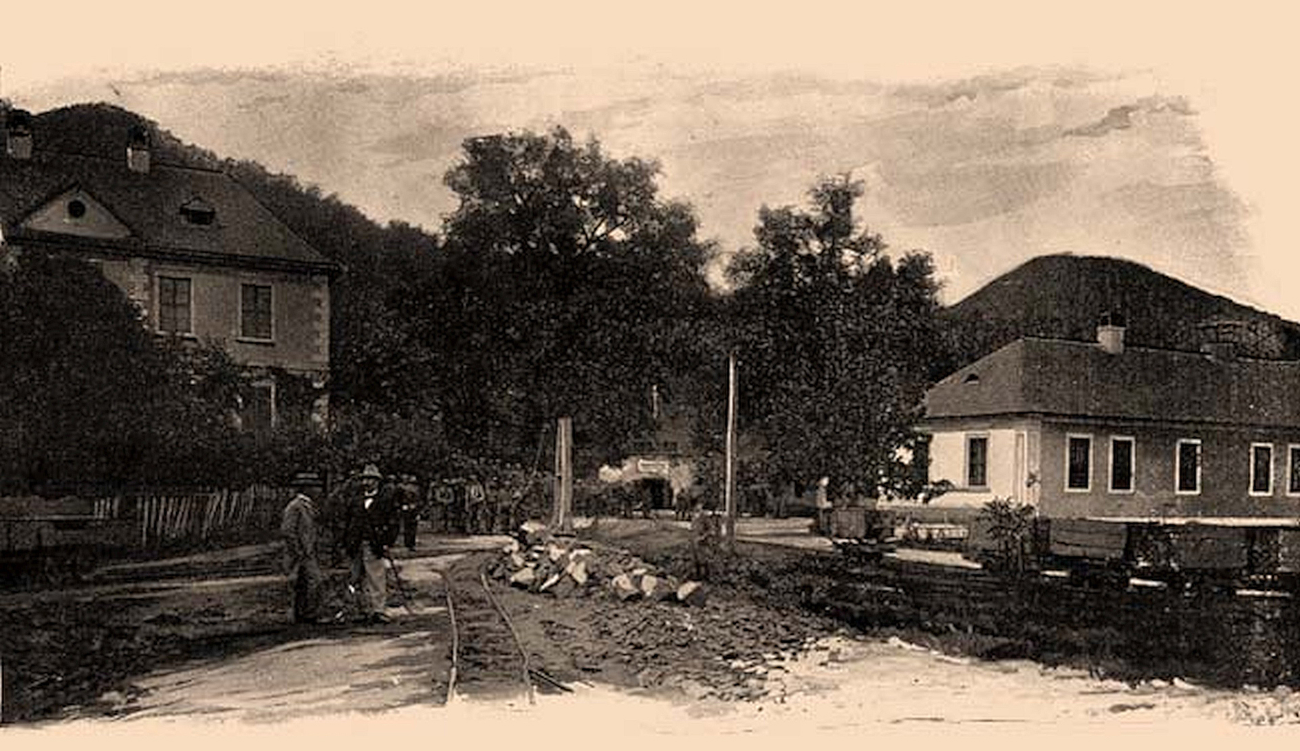 2 Mina Valea Roșie cca 1890 = Baia Mare, Mina «Valea Roșie» – clădirea administrativă și intrarea în mină, anii deceniului 1890, fotograf necunoscut, reproducere tripografică, prelucrare digitalizată, colecție privată, Baia Mare.