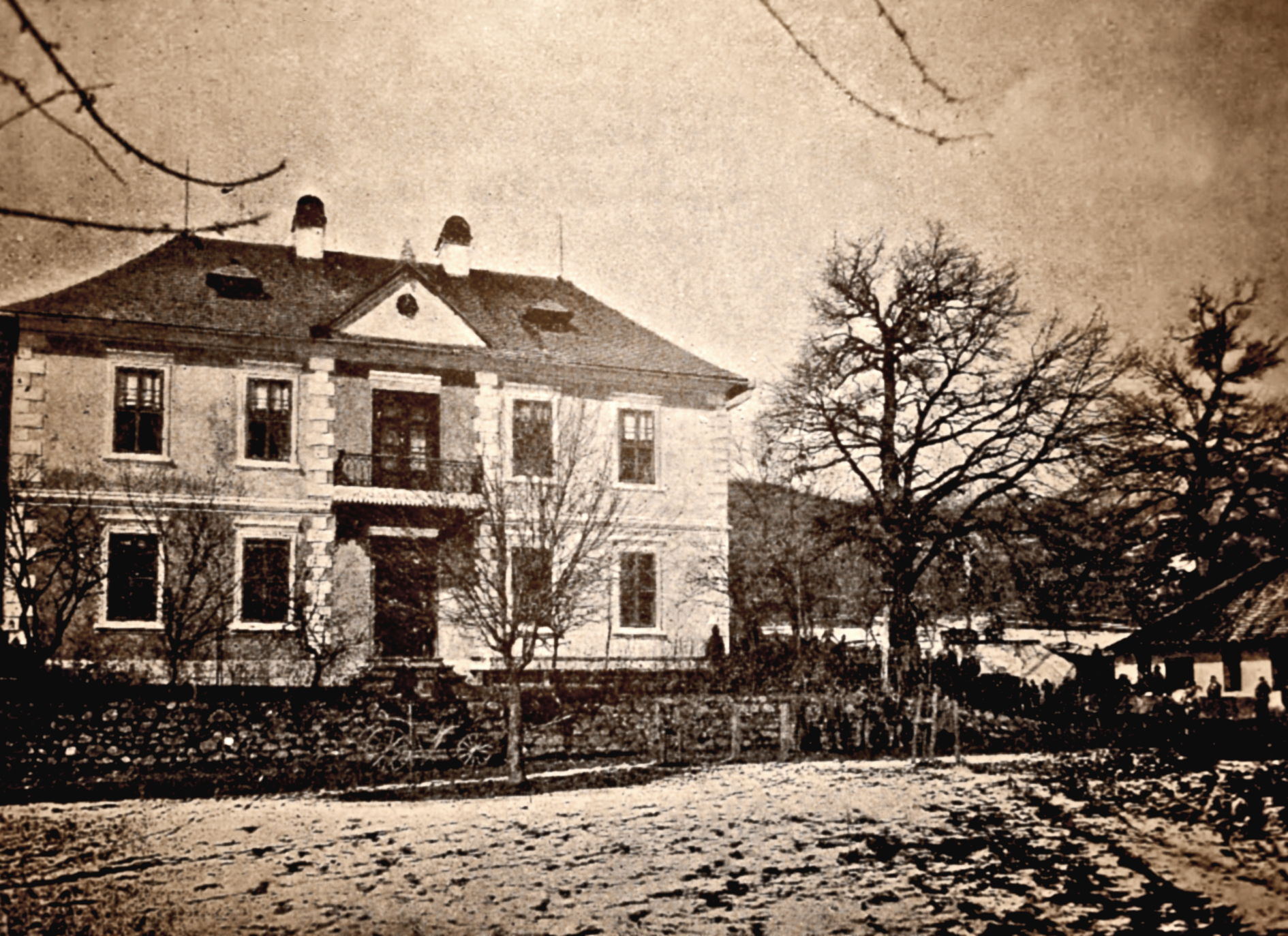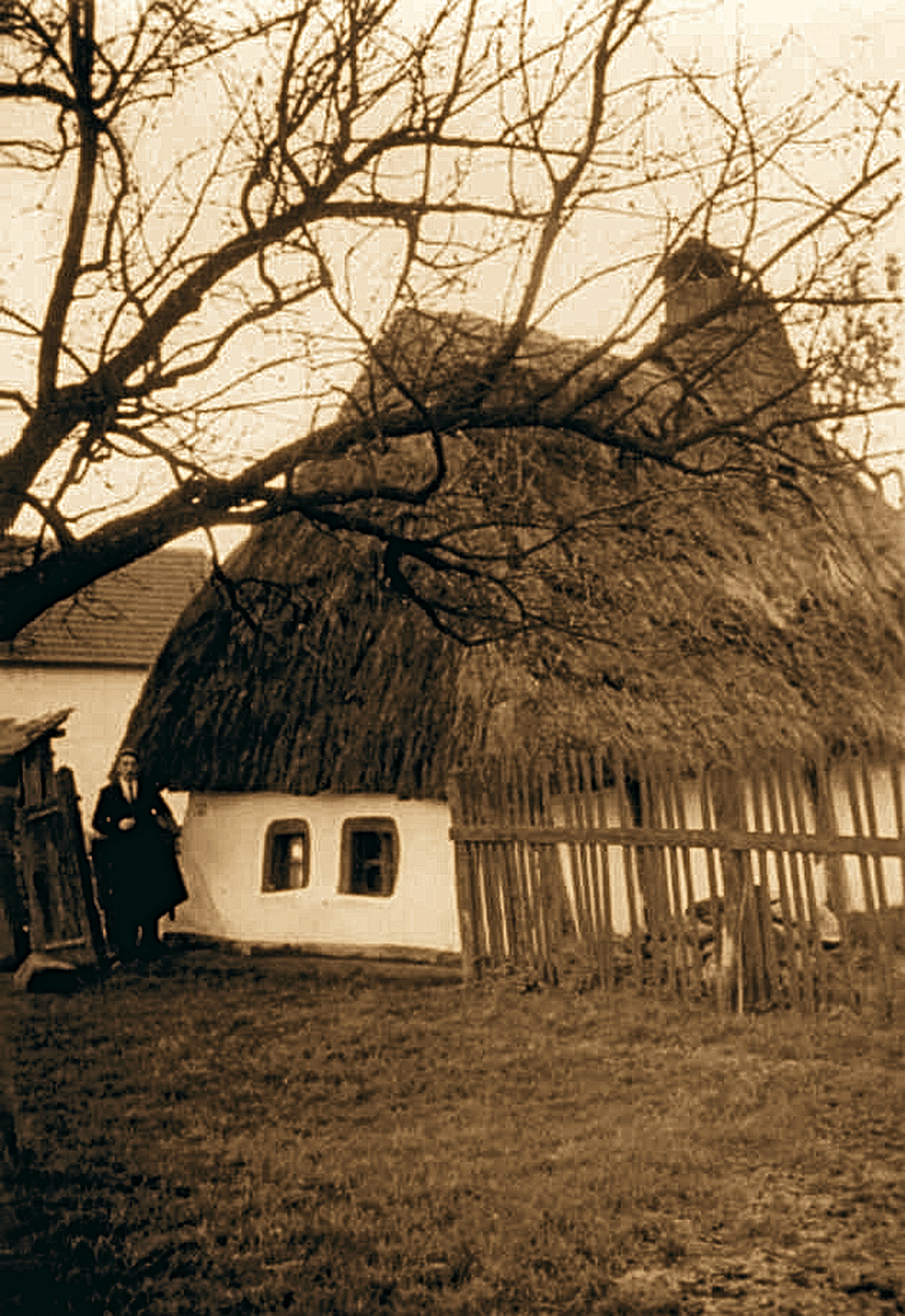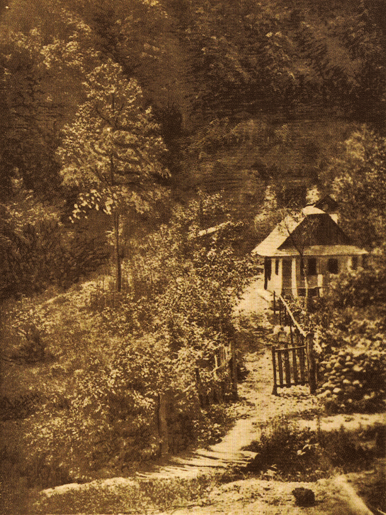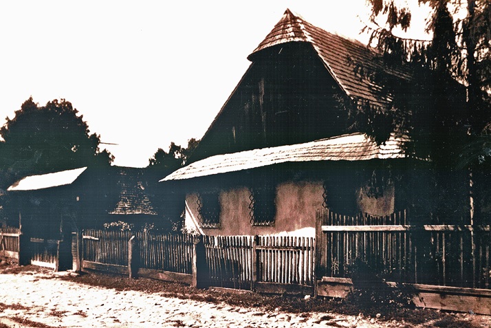 Ilustrația 1: Baia Mare, Cartierul «VALEA ROȘIE»: gospodărie minerească înstărită, cu acoperiș și poartă din lemn, în maniera arhitecturii tradiționale țărănești (fotograf necunoscut) fotografie de epocă, anii deceniului 1900 (?), prelucrare digitalizată, colecție privată, Baia Mare