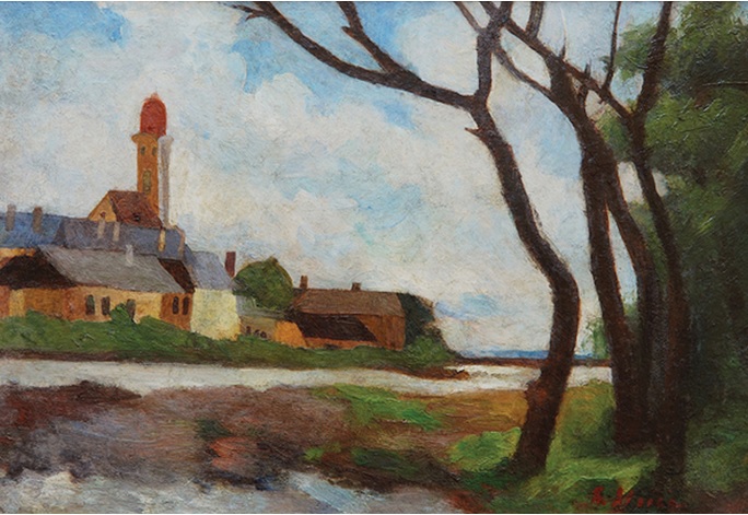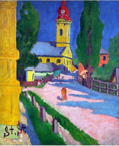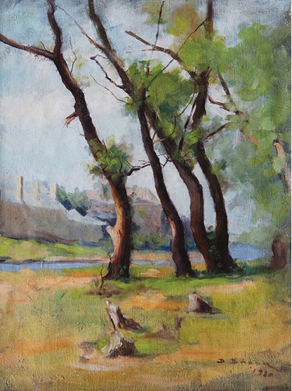 Nicolae STOICA, Peisaj de pe valea Săsarului spre Podul Viilor, cu Monetăria și Biserica Reformată, 1924, colecțiile Muzeului Județean de Artă «Centrul Artistic Baia Mare» (inițial: colecție privată, București)