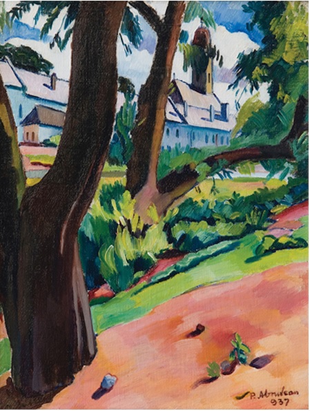 Petre ABRUDAN, Peisaj de pe malul văii Săsarului spre Podul Viilor, cu Monetăria și Biserica Reformată, 1937, colecțiile Muzeului Județean de Artă «Centrul Artistic Baia Mare» (inițial: colecție privată, București, în licitație publică la Galeria «Artmark», București)