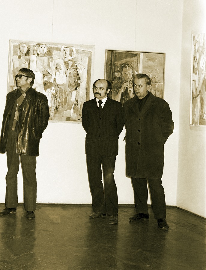 Ilustrația 10: Baia Mare, Secția de Artă a «Muzeului Județean Maramureș», 1977: Traian MOLDOVAN și Alexandru ȘAINELIC la vernisajul Expoziției Județene de Arte Plastice «MARAMUREȘ ’77», fotograf: Andrei Șuth, prelucare digitalizată, colecție privată, Baia Mare
