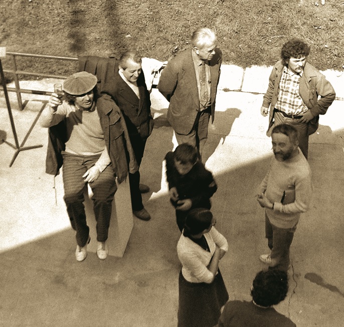 Ilustrația 12: Baia Mare, Curtea atelierelor de la «Vila Wagner», 1983: Mihai OLOS, Ioan IGNA (director al Muzeului Județean Maramureș), Alexandru Șainelic (președinte al Filialei Baia Mare a U.A.P), Gheorghe CRĂCIUN (președinte al Cenaclului Tineretului «ATELIER 35 Baia Mare»), Zoltán BITAY, Iudita CRĂCIUN, fotograf necunoscut, prelucare digitalizată, colecție privată Gheorghe Crăciun, Baia Mare