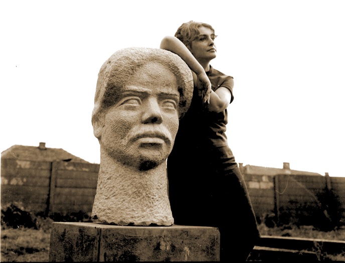 Ilustrația 3: Baia Mare, curtea «Clubului Tineretului», aprilie 1969: Valentina BOȘTINĂ și sculptura sa:«Portretul poetului Nicolae LABIȘ» (1967-1968), fotograf necunoscut, prelucare digitalizată, colecție privată, Baia Mare
