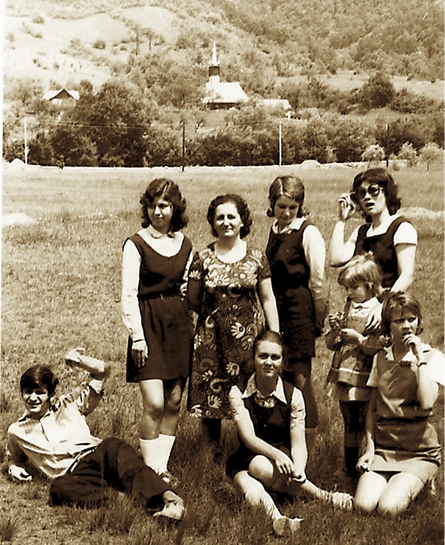 Ilustrația 4: Baia Mare, «Câmpul Tineretului», iunie 1973: artista și profesoara Ileana KRAJNIK–BITAY alături de câțava dintre absolvenții secției de arte plastice a Liceului de Muzică și Arte Plastice Baia Mare, promoția 1969-1973, fotograf necunoscut (Leonard Roman ?), prelucare digitalizată, colecție privată, Baia Mare