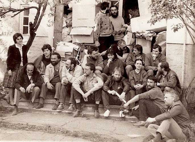 Ilustrația 5: Baia Mare, «Colonia Pictorilor», iunie 1988: Ilie CĂMĂRĂȘAN împreună cu tineri artiști dinCluj-Napoca, Alba Iulia, București, Arad, Craiova, Oradea, Târgu Mureș, Bistrița, Sibiu și Baia Mare – participanți la Expoziția Națională a Tineretului «ATELIER 35», fotograf necunoscut, prelucare digitalizată, colecție privată, Baia Mare