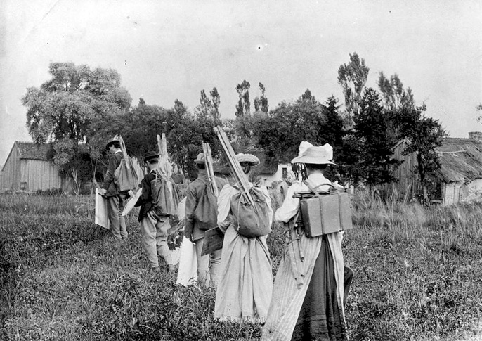Ilustrația 4: Colonia artistică Worpswede – Germania, Artiste și artiști în drum spre motivul unei sesiuni de pictură în plein air conduși de Fritz Overbeck, 1896, fotograf: Hermine Rothe, © Paula Modersohn Becker Stiftung, Bremen, Germania • sursa: https://www.schirn.de/en/magazine/context/2021/paula_modersohn_becker/the_first_urban_flight/