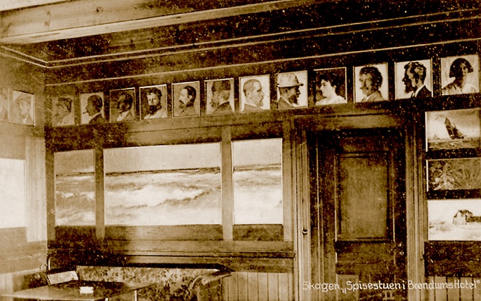 Ilustrația 5: Skagen (Danemarca), Hotel Brøndums–Restaurant «Sala Pictorilor», carte poștală de epocă, fotolitografie tipografică pe carton, 8,9 x 13,9 cm., anii deceniului 1920 • fotograf necunoscut, prelucare digitalizată, colecție privată, Baia Mare