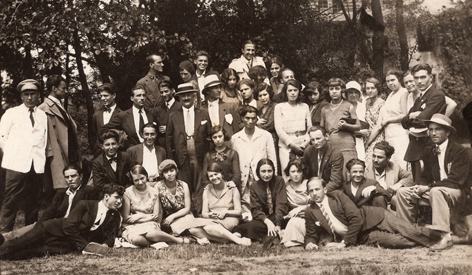 Ilustrația 6: Baia Mare, «Colonia Pictorilor», iunie 1930: profesorul ieșean Ștefan DIMITRESCU împreună cu tineri studenți–artiști dinCluj, Iași, București și Chișinău – coloniști temporari participanți în colonia studențească de studii de ară la Școala de Arte Frumoase din Baia Mare, fotograf necunoscut, prelucare digitalizată, colecție privată, Baia Mare