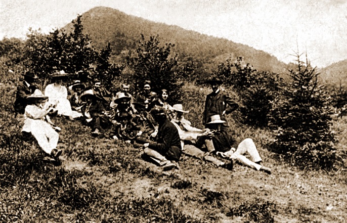 Ilustrația 7: Baia Mare, Dealul Florilor – grup de coloniști temporari de la Budapesta, cursanți ai «Școlii Libere de Pictură de la Baia Mare», iunie 1904: excursie de documentare și studiu în plein air • fotograf necunoscut, prelucare digitalizată, colecție privată, Baia Mare