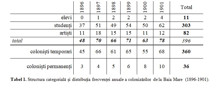 Născută odată cu sosirea la Baia Mare a „echipelor” colonizatoare, în vremea celor șase sezoane ale Școlii Hollósy (verile anilor 1896-1901), colonia s-a manifestat în două planuri distincte: pe de o parte prin atragerea sistematică a unor contingente temporare de elevi, studenţi şi artişti din afară; pe de altă parte prin stabilizarea permanentă a unui număr semnificativ de artişti. Aşadar, vom distinge din capul locului această dualitate a colonismului artistic băimărean – temporar / permanent –, fapt pe care îl vom analiza detaliat în cele ce urmează.
