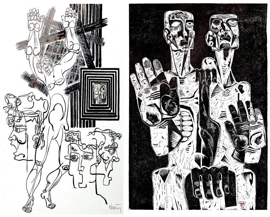 Ilustrația 8. Fotomontaj 9: • Chipuri, 1972, tușuri pe hârtie, 100 x 70 cm. • Orbii, 1972, linogravură pe hârtie, 100 x 70 cm.