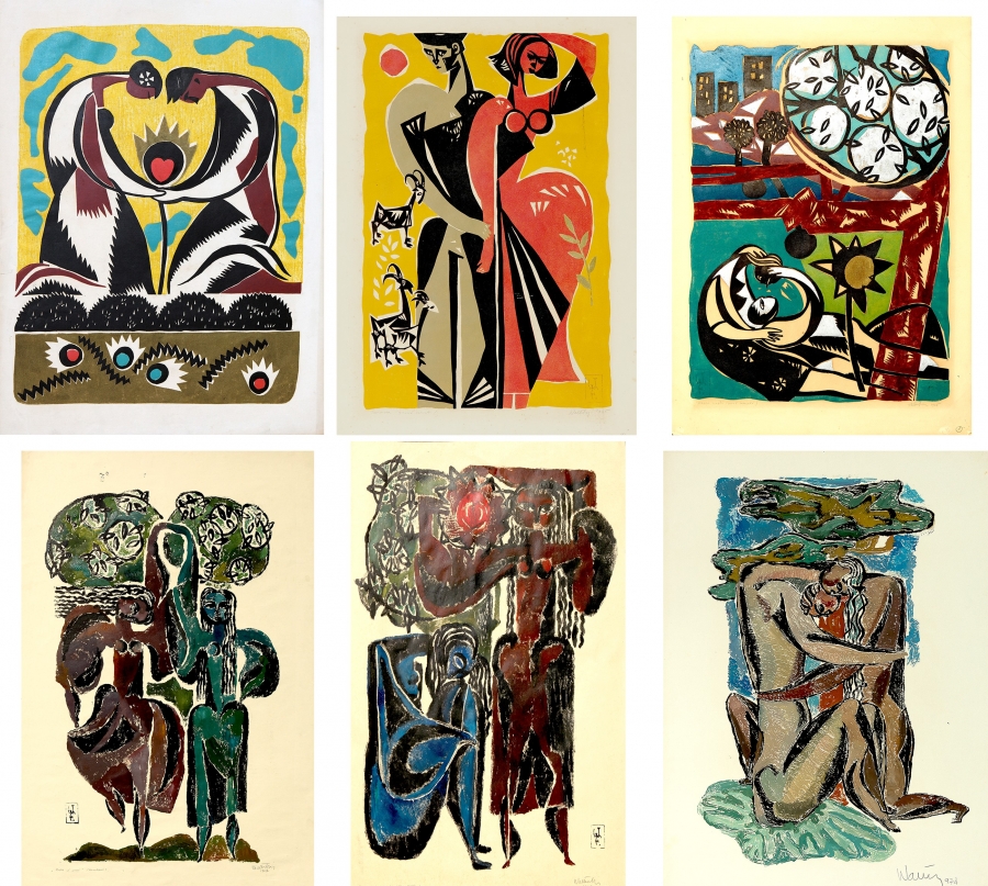 Ilustrația 1. Fotomontaj 2: • rândul de sus: Floarea iubirii, 1965; Toamna, 1965; Floarea nopții, 1965 – totate linogravuri color pe hârtie, 70 x 50 cm. / • rândul de jos: Zefir și pomi, 1967; Soarele și luna, 1967; Cuplu, 1974 – toate monotipii color pe hârtie, 100 x 70 cm.