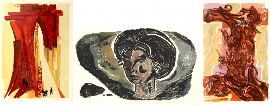Ilustrația 2. Fotomontaj 3: Viaduct, 1974, linogravură color pe hârtie, 98 x 69 cm. • Portretul soției artistului, monotipie color pe hârtie, 70 x 100 cm. • Adorație, linogravură color pe hârtie, 100 x 70 cm.