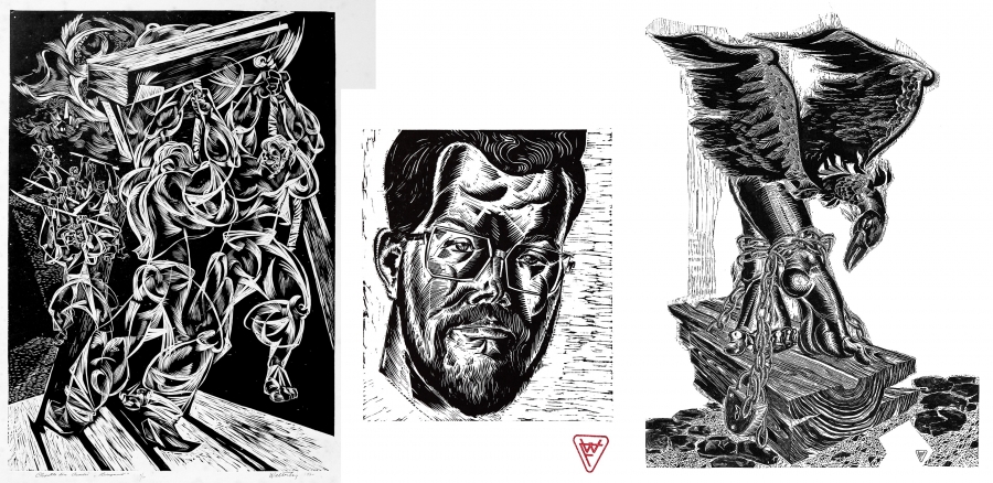 Ilustrația 3. Fotomontaj 4: • Clopotele, 1970, linogravură pe hârtie, 100 x 70 cm. • Portretul dr. Cseke Péter, 1982, linogravură pe hârtie, 50 x 35 cm. • Prometeu, 1981, linogravură pe hârtie, 100 x 70 cm.