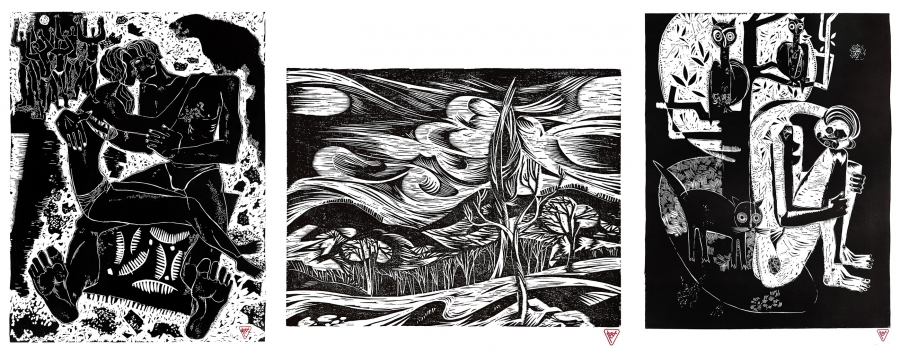 Ilustrația 4. Fotomontaj 5: • Îndrăgostiți pe plajă, 1966, linogravură pe hârtie, 100 x 70 cm. • După furtună, 1977, linograură pe hârtie, 50 x 70 cm. • Meditație, 1969, linograură pe hârtie, 70 x 50 cm.
