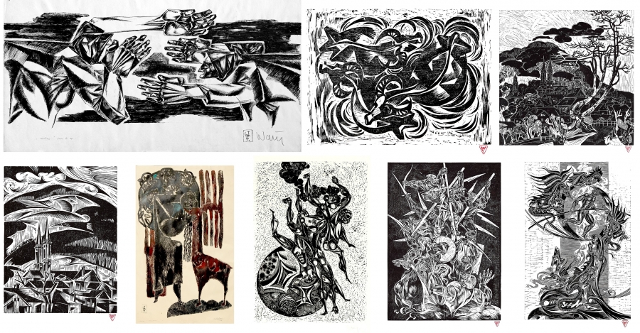 Ilustrația 6. Fotomontaj 7: Rândul de sus – Mâinile, 1969, tuș pe hârtie, 65 x 92 cm. • Tauri la scăldat, 1970, xilograură pe hârtie, 50 x 75 cm. • Baia Sprie – peisaj cu turnuri, 1982, linogravură pe hârtie, 70 x 70 cm. / Rândul de jos – Baia Sprie – peisaj cu turnurile bisericii, xilogravură pe hârtie, 70 x 50 cm. • Codrul, 1967, monotipie color, 100 x 70 cm. • Stele căzătoare, 1981, linogravură pe hârtie, 100 x 70 cm. • Lupta, 1970, , linogravură pe hârtie, 100 x 70 cm. • Echilibristul II, 1976, , linogravură pe hârtie, 70 x 50 cm.
