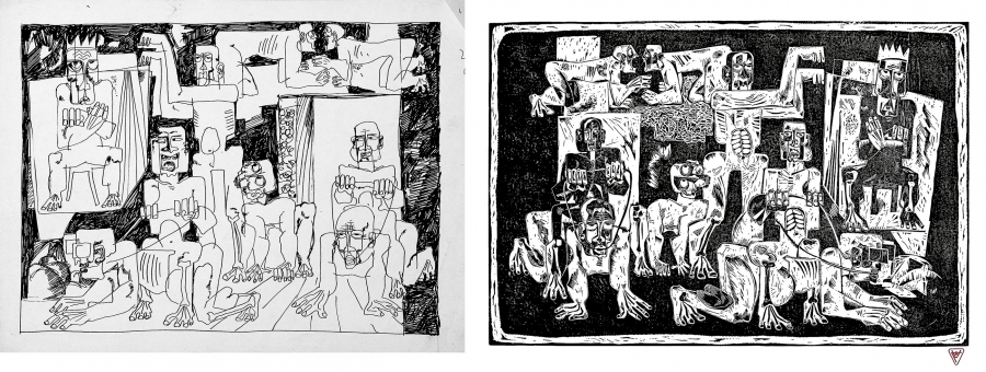 Ilustrația 7. Fotomontaj 7: Politica, 1972 (schiță de concept), tuș pe hârtie, 31 x 41 cm. • Politică, 1972 (versiune definitivă), linogravură pe hârtie, 70 x 100 cm.