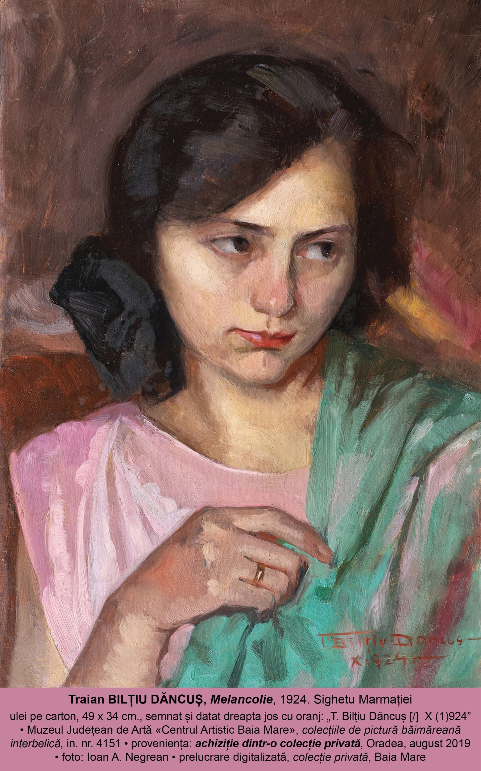 Astfel, lucrarea Melancolie din 1924 – un rafinat portret de interpretare psihologică – ne relevă faptul că spre finalul anilor de studii bucureștene, Traian Bilțiu Dăncuș își însușise deja, în mod temeinic și creativ, reperele de transpunere și de interpretare nuanțat realistă ale motivului antropomorf. Conform datării olografe a artistul, acesta a realizat lucrarea cândva în cursul lunii octombrei 1924 – adică imediat după reîntoarcerea în orașul natal la încheierea studiilor academice și după cea de a treia sa participare la coloniile studențești băimărene. Este, așadar, deplin firesc să regăsim aici expresia asimilării la cel mai înalt nivel profesional a lecțiilor formative dobândite din partea celor doi maeștri educatori bucureșteni, din mentoratul cărora s-a împărtășit cu deplin succes – ambii remarcabili portretiști – Ipolit Strâmbu și George Demetrescu Mirea !