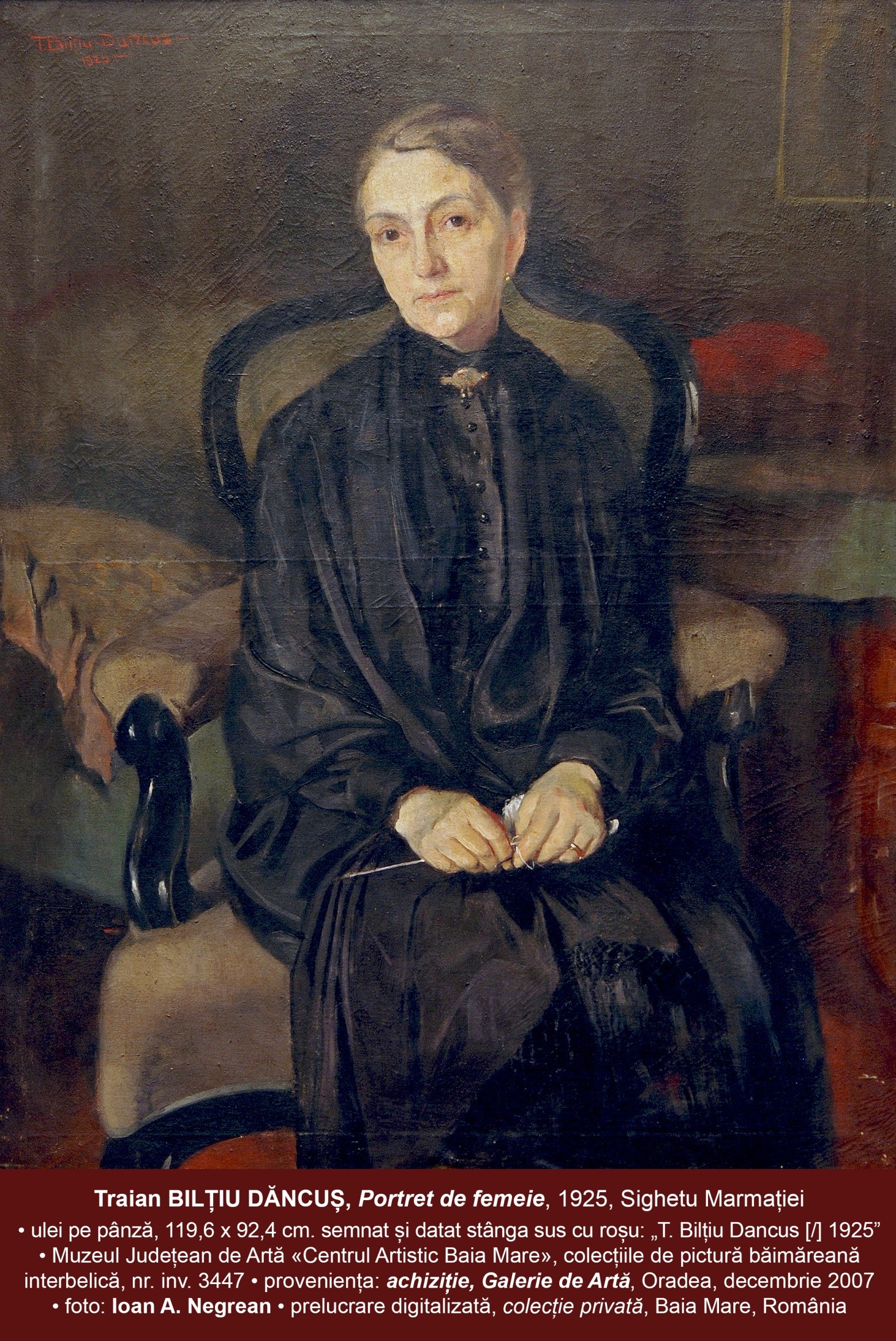 Izvoare de istorie orală, neconfirmate (încă) documentar, ne fac să înțelegem că avem portretizată aici bunica artistului (pe linie paternă ?), ipostaziată în ambianța unei camere impregnată de vechime (dar nu neapărat și de „îmbătrânire” !). Ne întâlnim cu distincția întrucâtva aristocratică a unei doamne în vârstă, al cărei portret de interpretare psihologică ne evocă istoria și identitatea generației elitei „intelighenției” intelectualității românești maramureșene căreia îi datorăm militantismul pentru edificarea „cauza națională” în făptuirea Marii Uniri în 1918. Altă generație, firește, cu alte orizonturi existențiale, înrădăcinate în timpi istorici și în realități ale unui trecut înspre care chipul personajului pare să privească cu serenitate, și cu seninătatea împăcată a misiunii ideplinite. Adecvându-și mijloacele de transpunere plastică la aceste particularizări, artistul a adoptat mijloace și „instrumentalizări” picturale mai sobre”, mai potolite, într-o gamă tonală închisă, dominată de ocruri și „pământuri” vibrate cu discreție, focalizându-și centrul de interes asupra portretului, mâinilor și vestimantației negre ale personajului. Încă odată, măiestria picturală – înscrisă în aceeași matrice estetică a realismului de interpretare psihologică – ni se relevă în sugestia materialității și transparențelor mătăsoase ale vestimentației negre pe care personajul o poartă cu o nobilă și superioară distincție.