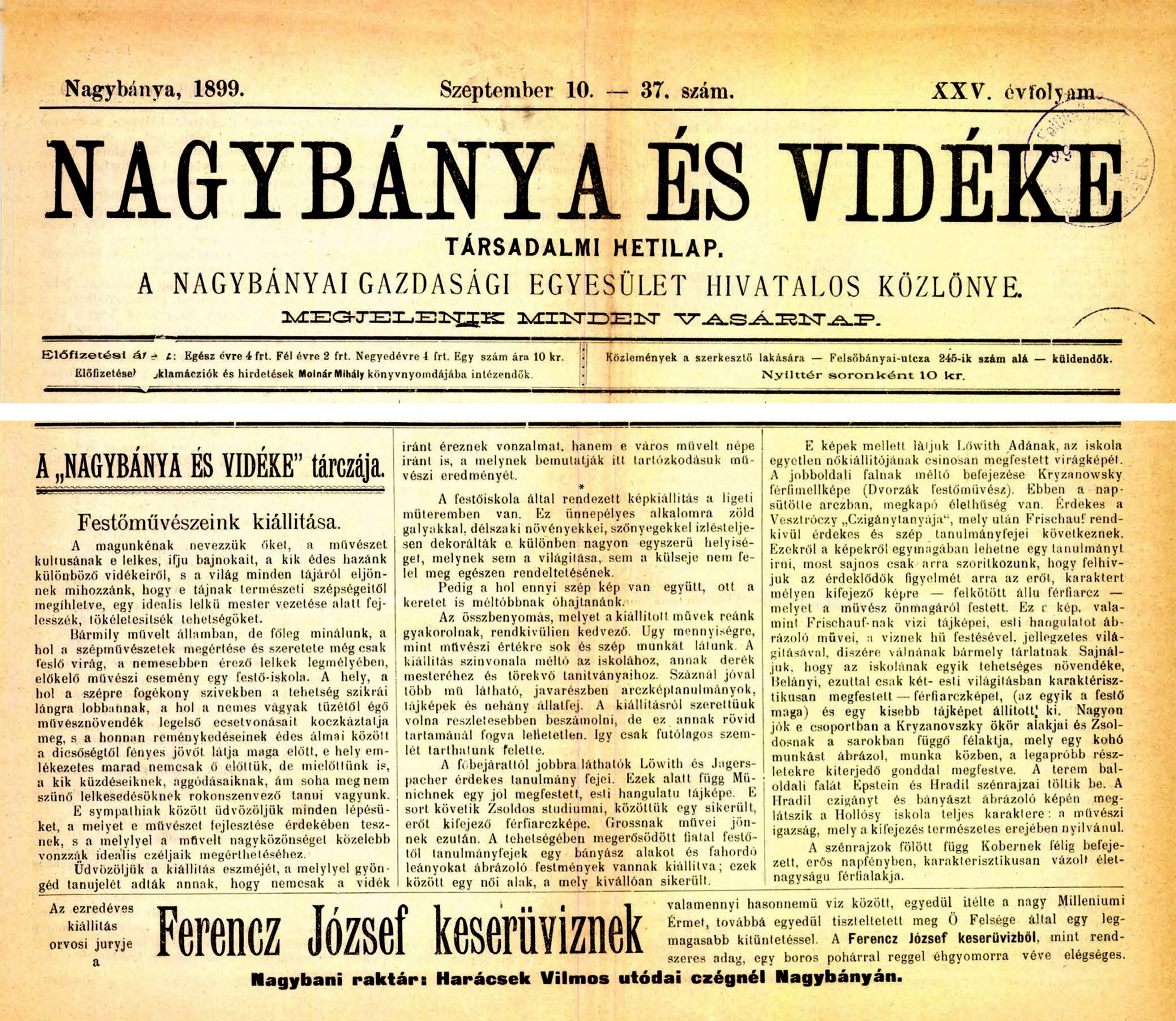 - prima cronică de artă plastică modernă apărută în mass-media băimăreană pe care o datorăm avocatului și consilierului local băimărean dr. Imre Harácsek, care a publicat-o sub titlul „Festőművészeink kiállitása”/Expoziția pictorilor noștri, ca editorial în paginile săptămânalului social băimărean de limbă maghiară Nagybánya és Vidéke, an XXV, 1899, nr. 37, 10 septembrie, p. 1.
