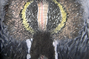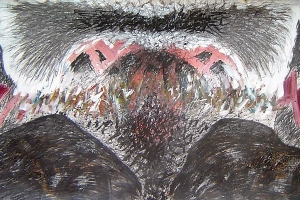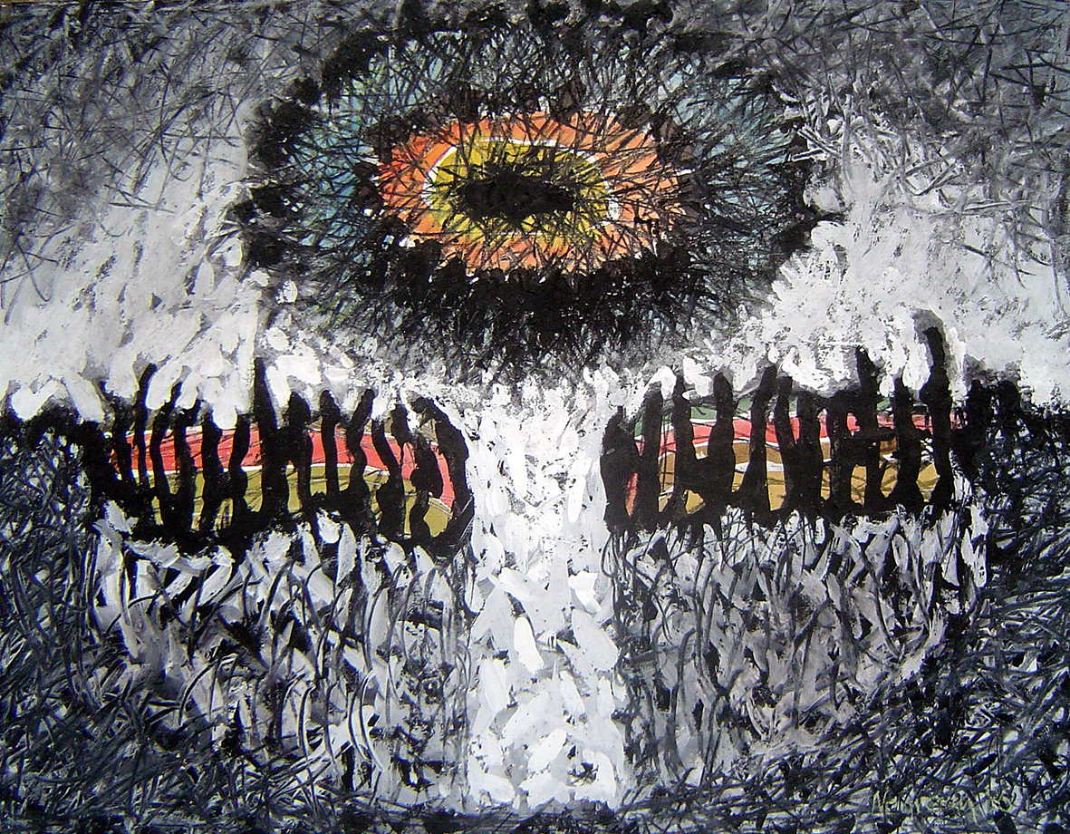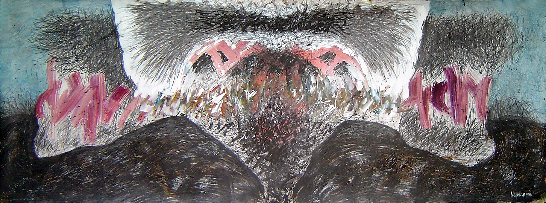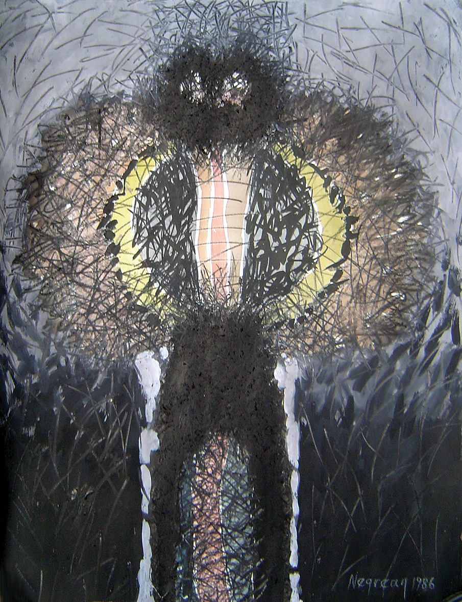 1 Cuibul soarelui 86 = Cuibul soarelui, 1986, cărbune+tuș+acuarelă+cretă pe hârtie, 50 x 70 cm., semnat și datat dreapta jos cu galben: „Negrean (19)86, colecție privată / © Ioan Angel Negrean.
