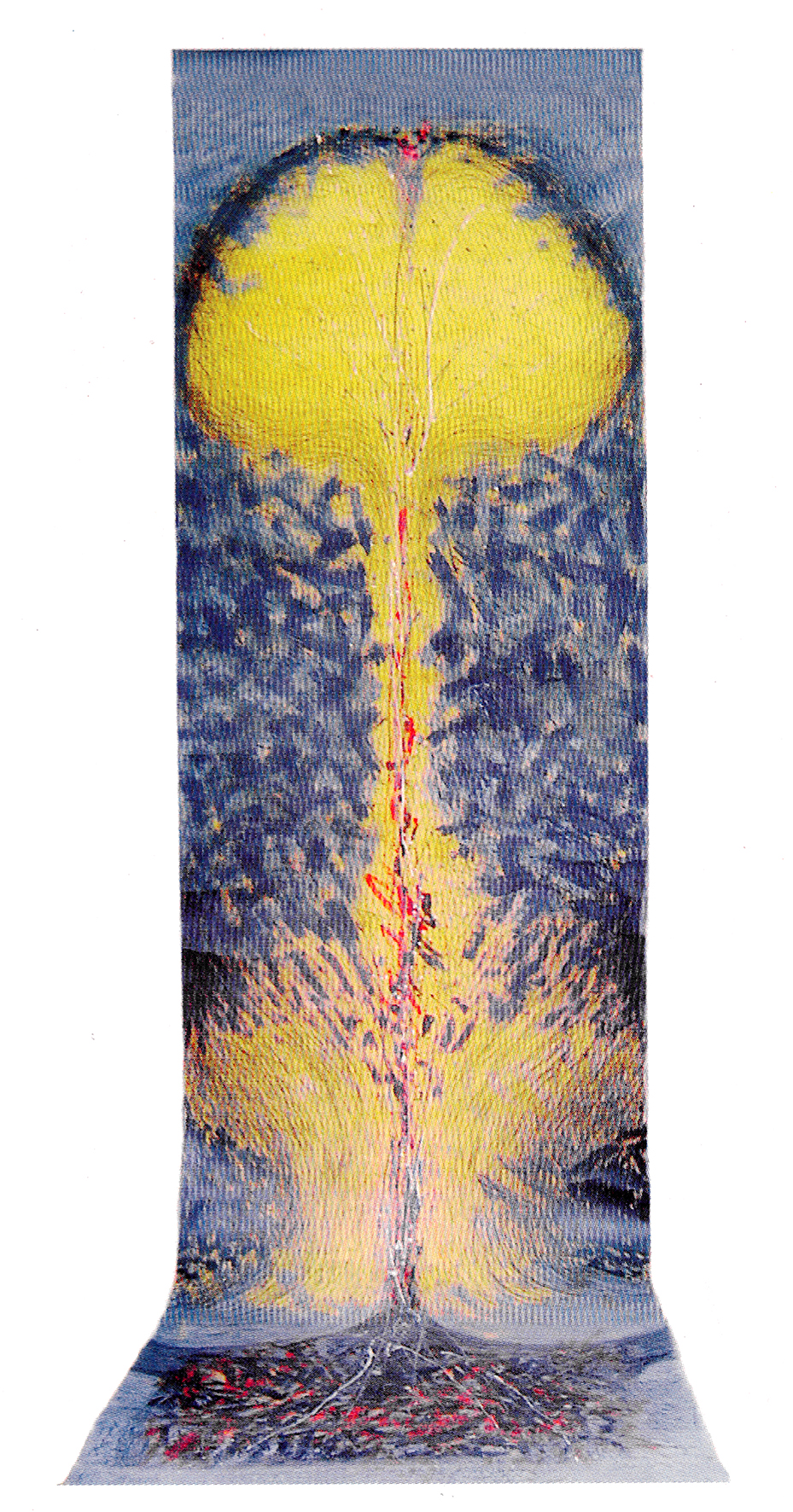 Alt exemplu din aceeaşi perioadă este Pomul vieţii (1986), lucrare al cărei subiect l-am reluat şi mai târziu. Conţine de asemenea expresia dorinţei de a găsi forma plastică a momentului conceperii prin reprezentarea motivului falic, un axis mundi pe o verticală înaltă, ascendentă, care porneşte de pe planul orizontal al pământului şi se ridică spre cer, aidoma grâului germinat care parcurge acelaşi traseu în devenirea fiinţării lui. Este şi aici prezentă simetria faţă de o verticală care străbate lucrarea de jos în sus, de la rădăcină până la inflorescenţă, la ieşirea din pagină. Cromatica lucrării este dominată de galbenul care devine strălucitor pe fundalul vibrat în nuanţe de violet. Tehnica folosită este, ca şi în cazul anterior, una mixtă, pe acelaşi suport de carton preşpan, ce se găsea ca materie primă la intreprinderea seineană de materiale abrazive. (…)” [7]