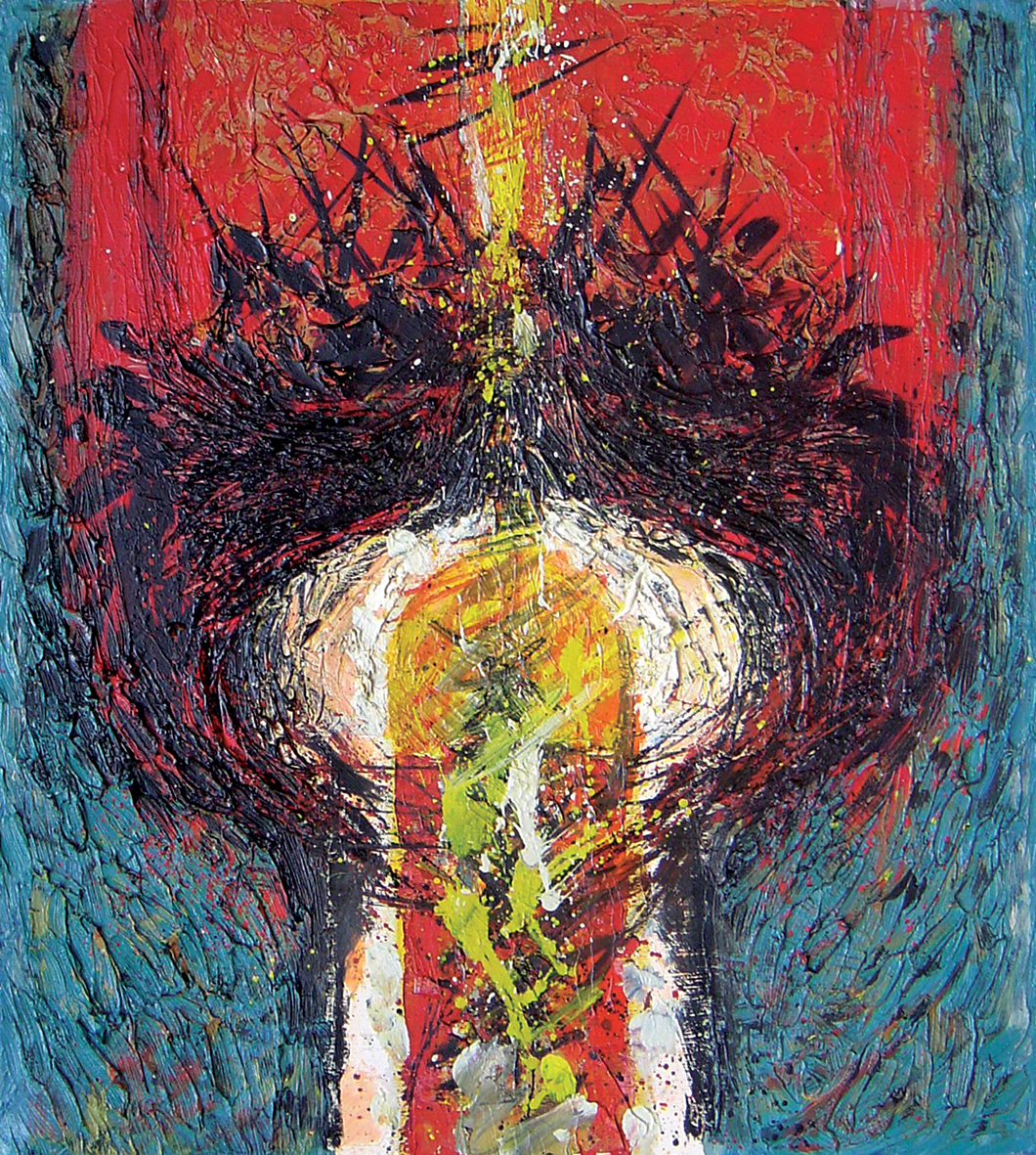 Apoi, din dorinţa de a mă exprima pe suprafeţe mai mari, şi de asemenea din dorinţa de translare a problematicii facerii, a genezei, a fecundaţiei în sfera umanului, am ales rostiri plastice prin mijloacele de expresie specifice artei abstracte şi semiabstracte, singura posibilitate care putea să mă apere, la acea vreme, de «filtrul» atât de bine organizat al «aparatului de partid». Exemplul concludent în acest sens este lucrarea Maluri (1986), una din primele lucrări care exprimă plastic această dorinţă. Realizată în tehnică mixtă (cărbune, tuş, guaşe, tempera, cretă colorată) pe carton preşpan (hârtie trasă pe folie de plastic) folosit ca suport pentru diverse materiale abrazive, lucrarea are ca modalitate principală de organizare a spaţiului plastic, simetria. Este modalitatea folosită de mine pentru a exprima dualitatea primară a existenţei, bărbatul şi femeia (Adam şi Eva), comuniunea dintre cele două entităţi generice ale existenţei primordiale a umanităţii, condiţia primordială necesară procreerii, fundamentul creării «oului» care face posibilă naşterea şi implicit perpetuarea speciei. Între cele două maluri curge, se zbate, rezonează seva plămadei ce prin unire va da naştere noii vieţi. Sunt prezente în această lucrare mai multe fluxuri energetice, care se distribuie în principal pe orizontală şi pe verticală, cele două direcţii fundamentale care dublează simetria faţă de axa verticală cu o cvasisimetrie pe orizontală. Ritmurile se dinamizează prin conturul formelor oblice şi prin tuşele ferme, când late, când subţiri, aşezate în diferite direcţii care animă suprafaţa lucrării. Contrastele care definesc imaginea sunt în principal cele valorice, culorile fiind prezente pe suprafeţe mai mici.