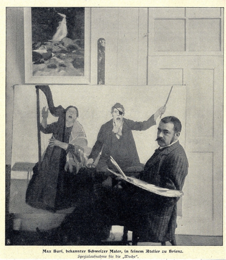 Ilustrația 1: Interlaken (Elveția), Max Buri la șevalet în atelierul său din Brienz (publicată în săptămânalul ilustrat german din Berlin Die Woche, 1907) • sursa: By Photographer not credited – Die Woche [Berlin/Germania], 1907, Public Domain, https://commons.wikimedia.org/w/index.php?curid=64309772