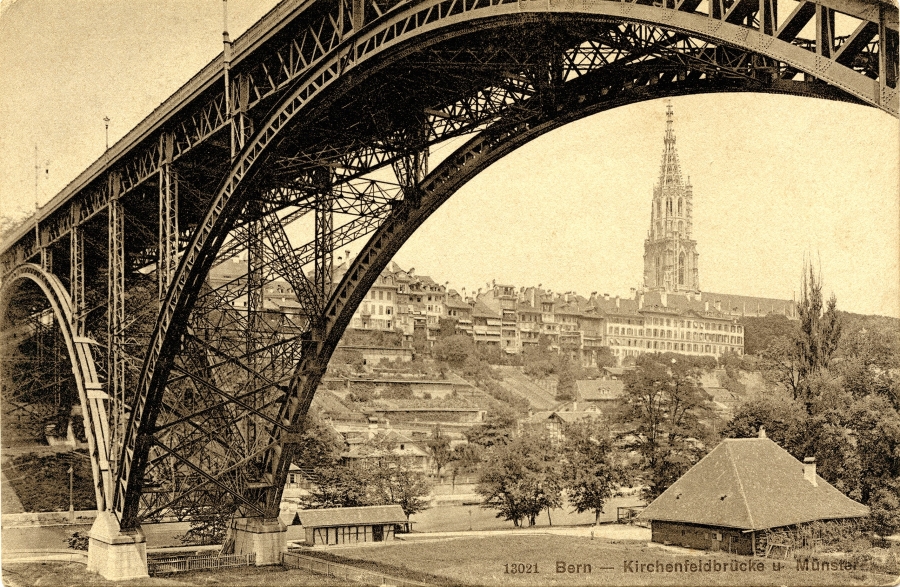 Ilustrația 2: Berna (Elveția), Podul Kirchenfel (construit între 1881-1883, inaugurat la 24 septembrie 1883: constructor: Gottlieb Ott&Cie Bern / ingineri – Moritz Probst și Jules Rothlisbergee • finanțator: Berne Land Company Ldt. London) • fotograf necunoscut, carte poștală de epocă, cca. 1898 • fotolitografie tipografică pe carton, cca 10 x 14 cm. • colecție priată, Baia Mare, prelucrare digitalizată