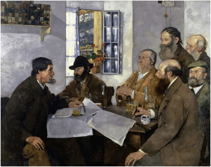 Ilustrația 1: Max Buri,Politicienii satului, 1904, ulei pe pânză, 171 x 217 cm.,©Kunstmuseum Basel, inv. nr. 36246/ deposit: Schweizerische Eidgenossenschaft, Bundesamt für Kultur • foto: SIK-ISEA, Zürich