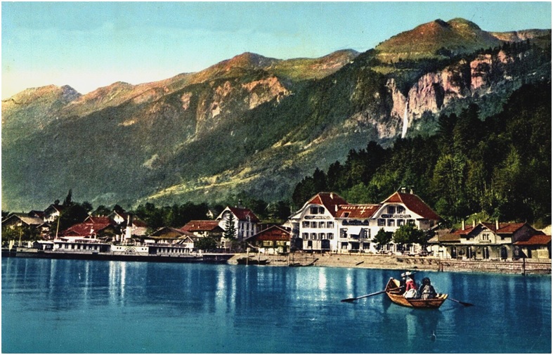 Ilustrația 14: Brienz(Elveția),Lacul, gara, debarcaderul bărcilor și Hotel Kreuz• fotograf necunoscut, carte poștală de epocă, cca. 1894 • fotochromolitografie tipografică pe carton, cca 11 x 15 cm. • colecție privată, Baia Mare, prelucrare digitalizată