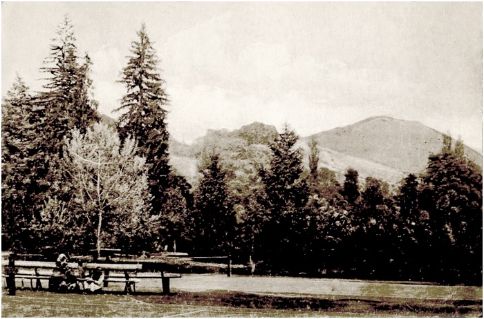 Ilustrația 2: Baia Mare,Parcul orașului cu perspectivă panoramată spre Dealul Florilorși Dealul Crucii, fotograf necunoscut, carte poștală de epocă, fotolitografie tipografică pe carton, cca 10 x 14 cm. • colecție privată, Baia Mare, prelucrare digitalizată
