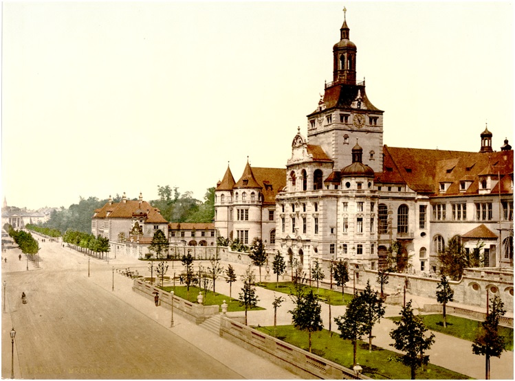 Ilustrația 2: München,Palatul vechiului Muzeu Național, 1895, situat pe bulevardul Maximilian, care a servit de locație pentru câteva ediții ale expozițiilor anuale organizate de Münchener Künstergenossenschaft în anii de final a veacului al XIX-lea •fotograf necunoscut, carte poștală de epocă, fotochromolitografie tipografică pe carton, cca 11 x 15 cm. • colecție privată, Baia Mare, prelucrare digitalizată.