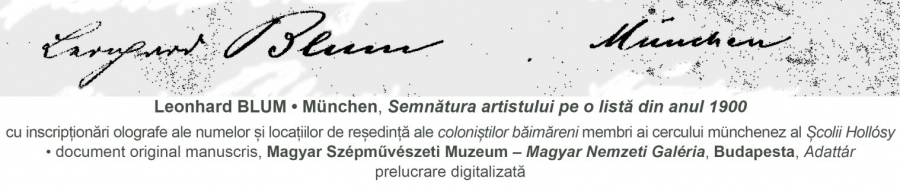 „Şcoala de pictură Hollósy (…) a trimis lista acelor pictori [subl. n.–T.A.] care vor sosi aici la întâi mai. Aceştia sunt următorii: (…) Leonhard Blum (…). Studenţii academiei din Paris [referire la Academia Julian]: (…). Artişti [străini] participaţi la expoziţii în străinătate, studenţi mai vechi ai şcolii [Hollósy, la München] : (…). Artişti indigeni: (…). Vor fi prezenţi aici în continuare: (…) [n. şi subl. n.–T.A.]” (cf. NaVi, XXV (1899), nr. 15.)