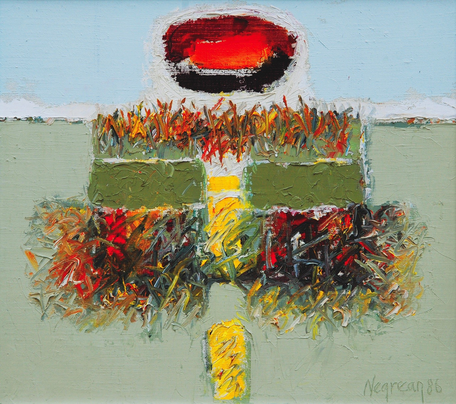 Exponent de marcă la nivel naţional al «congregaţiei» de grup la definirea identităţii căreia contribuie, nuanţat şi pluralist, de peste patru decenii («generaţia ‘80»), băimăreanul Ioan Anghel Negrean a fost mereu – şi rămâne pe mai departe – adeptul unui discurs creativ de tip ficţional aflat, însă, într-o relaţie de dialog flexibil cu reperele majore ale realului lumii dimprejur. Cu ani în urmă consemnasem observaţia că rădăcinile imaginarului construit de artist coboară până în anii deceniului 1960, şi se ramifică prin experienţele iniţiatice ale copilăriei [1], experienţe ale căror impact modelator a fixat două dintre constantele orizonturilor ce-i caracterizează definitiv viziunea picturală: cultul colorismului dens şi vitalist, respectiv arhitectura spaţiului plastic centrată pe linia blagiană a unduirilor „deal–vale–deal” atât de specifică unităţii geografiilor vizuale și spirituale a întregului spaţiu transilvan [2].