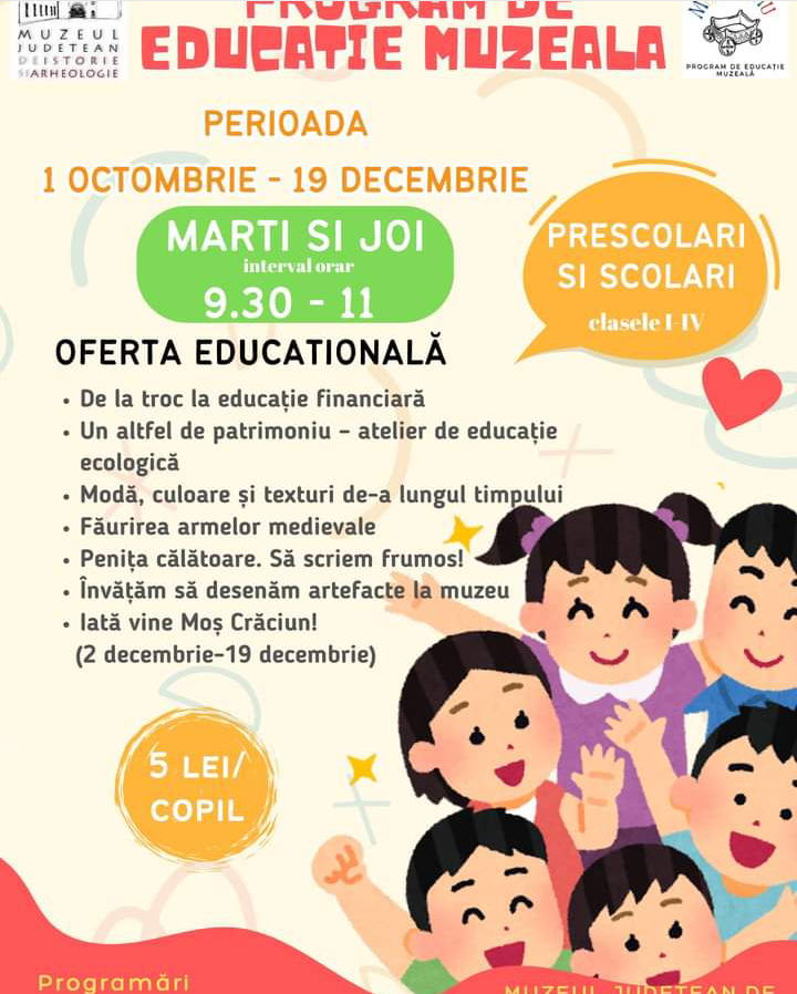 Muzeul Județean de Istorie și Arheologie Baia Mare organizează în perioada 1 octombrie – 19 decembrie 2024, Programul de educație muzeală „Muzeul viu”. Acesta se va desfășura de două ori pe săptămână, în zilele de marți și joi, în intervalul orar 9:30-11:00.