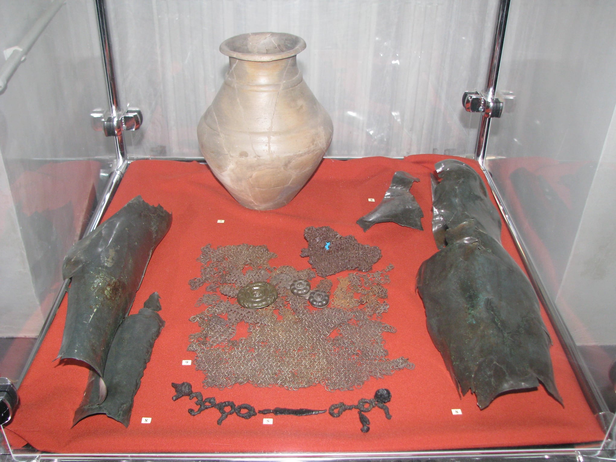 Armura a fost făcută din inele din fier, simple, nenituite, realizată prin îmbinarea unor șiruri paralele și succesive de verigi circulare cu diametrele de 0,8 și 1,1 cm și grosimea sârmei de 1 mm. S-a păstrat fragmentar, are 2.780,00 gr. și dimensiunile de 41,00 cm x 41,00 cm. A fost datată în perioada La Tène C1 (a doua jumătate a sec. III a. Chr. – începutul sec. II a. Chr.).